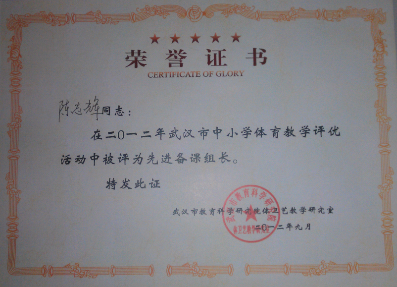 2012年9月我校體藝處體育教研組在武漢市教育科學(xué)研究院體衛(wèi)藝教學(xué)研究室舉辦的“武漢市中小學(xué)體育教學(xué)評優(yōu)活動”中榮獲“先進備課組”,且體藝處陳志輝主任獲得“先進備課組長”。