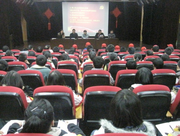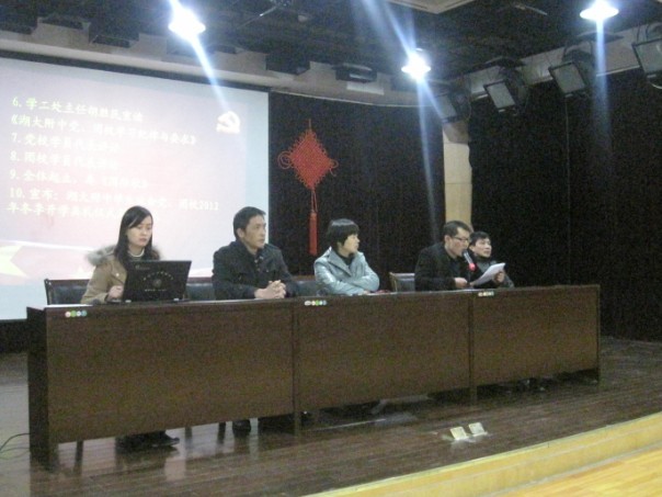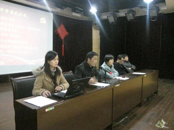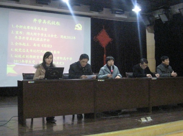12月10日星期一下午第八節(jié)課,湖大附中學(xué)生業(yè)余黨、團(tuán)校2012年冬季開學(xué)典禮在二樓報(bào)告廳舉行。校黨總支書記何鳳桃,副校長(zhǎng)劉朝新,學(xué)工處主任胡勝民,副主任曾國(guó)斌,團(tuán)委書記張莉、團(tuán)委會(huì)全體委員和近兩百名黨、團(tuán)校學(xué)員一起參加了開學(xué)典禮。