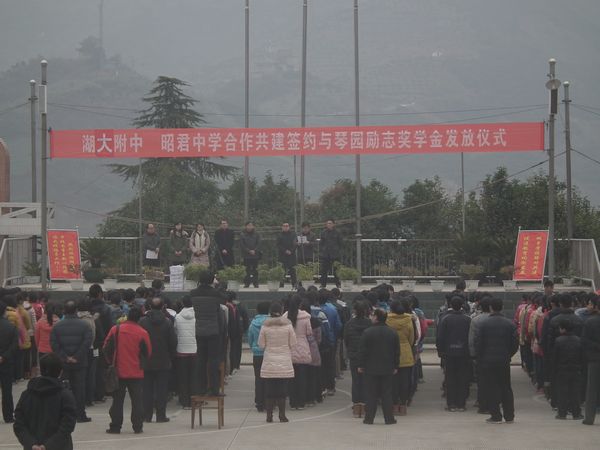 首先,昭君中學(xué)校長王強(qiáng)和我校校長李玉新分別致辭,并正式簽訂了雙方學(xué)校合作共建協(xié)議書。這次合作本著“全面共建、突出重點(diǎn);互促雙贏、共同發(fā)展”的活動原則,實(shí)現(xiàn)開放辦學(xué),對口交流的目標(biāo)。并將逐步實(shí)現(xiàn)干部互訪、教師互訓(xùn)、學(xué)生互助、課程共建、資源共享、活動聯(lián)誼和勵志獎學(xué)金發(fā)放等活動措施。然后,儀式上我校向?qū)Ψ矫棵處熀兔棵麑W(xué)生分別捐贈教育書籍和筆記本。最后,我校對昭君中學(xué)20名品學(xué)兼優(yōu)的貧困學(xué)生發(fā)放了“琴園”勵志獎學(xué)金。