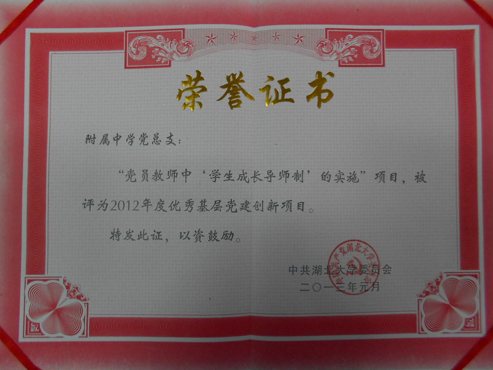2013年1月8日,我校黨總支承擔的黨建項目和綜合黨支部開展的主題黨日活動受到湖北大學黨委表彰。