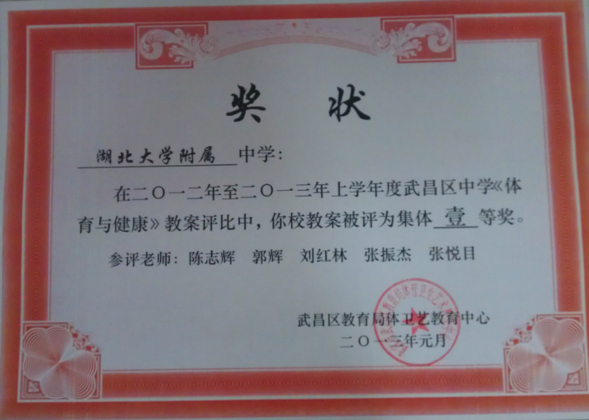 在2012年-2013年上學(xué)年度武昌區(qū)中學(xué)《體育與健康》教案評比中,我校教案被評為集體一等獎。