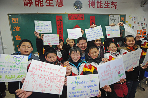 班會(huì)最后,每個(gè)同學(xué)都在一張卡片上面寫下了自己好的新年愿望:“2013年,讓我們一起……”并將這張卡片交給了彭老師,希望他能把自己美好的祝愿帶給山區(qū)的孩子。