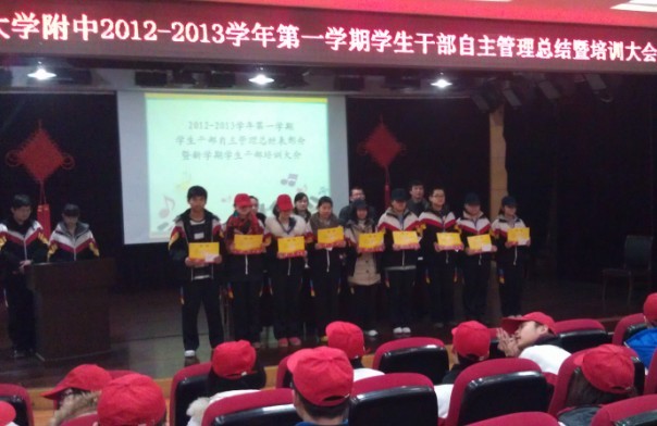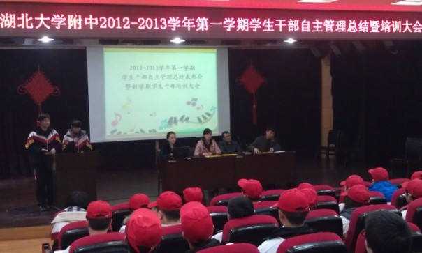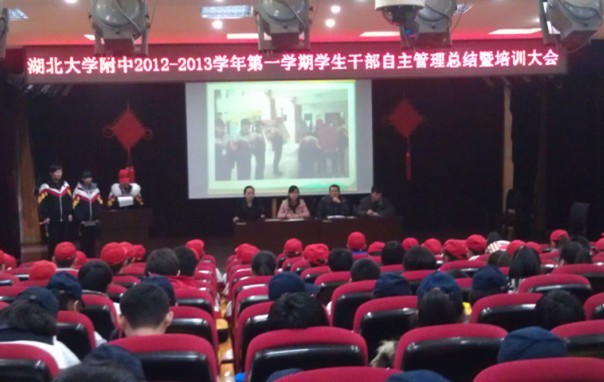 2月27日中午1點(diǎn),我校2012-2013學(xué)年第一學(xué)期學(xué)生干部自主管理總結(jié)表彰暨新學(xué)期培訓(xùn)大會(huì)在報(bào)告廳舉行。學(xué)工處主任胡勝民、副主任曾國斌、團(tuán)委書記張莉、大隊(duì)輔導(dǎo)員魯芳蕾及全體校級學(xué)干、各年級學(xué)干參加會(huì)議。校廣播臺學(xué)生葉思儀、尹哲倫主持會(huì)議。