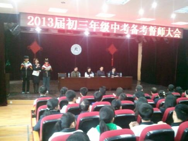 陽春三月,春暖花開,伴隨著中華人民共和國國歌,3月15日,我校216位畢業(yè)班同學(xué)和全體畢業(yè)班教師齊聚在二樓報(bào)告廳,隆重舉行“湖大附中2013屆中考備考誓師大會及感恩教育活動(dòng)”,附中黨總支書記何鳳桃,副校劉朝新,校長助理魏偉,學(xué)工處、教務(wù)處、初中部主任以及初三年級家長委員會的各位家長出席了大會,德育校長劉朝新作了動(dòng)員講話,整個(gè)活動(dòng)在熱情洋溢、濃濃深情中順利進(jìn)行。