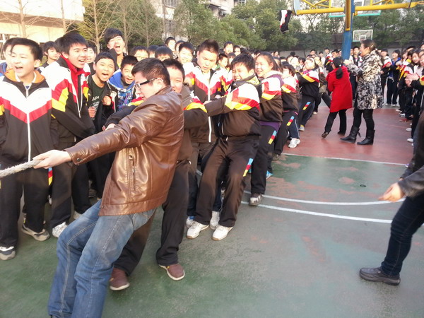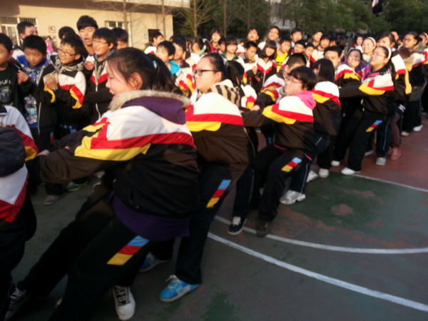 由于初三學(xué)生在身高、體重方面占了絕對優(yōu)勢,初二年級則在戰(zhàn)術(shù)上做足了功課。首先,在人員挑選上,全年級一盤棋,從各班選出了一批精兵強(qiáng)將;其次,提前進(jìn)行了預(yù)演,編排隊(duì)伍,講授技巧,實(shí)戰(zhàn)演練。果然,機(jī)遇賜予有準(zhǔn)備的人,一開賽,初二級隊(duì)的同學(xué)們一鼓作氣,連勝兩局。初二全體同學(xué),一片沸騰,高興得手舞足蹈。