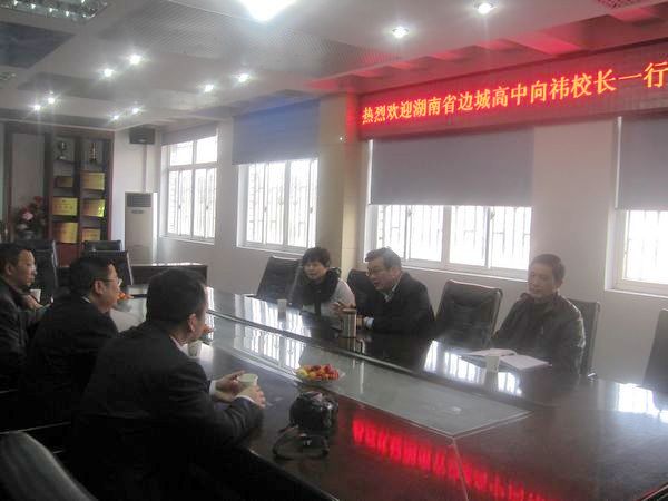 3月27日上午,湖南花垣邊城高級中學(xué)校長向煒、副校長陳秀坪帶領(lǐng)學(xué)校部門負(fù)責(zé)人一行五人來我校參觀考察。學(xué)校校長李玉新、黨總支書記何鳳桃、副校長劉朝新、教務(wù)處主任黃炳香在二樓會議室熱情接待了考察團一行。