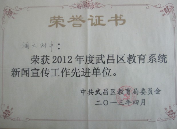 2013年4月—榮獲2012年度武昌區(qū)教育系統(tǒng)新聞宣傳工作先進單位。