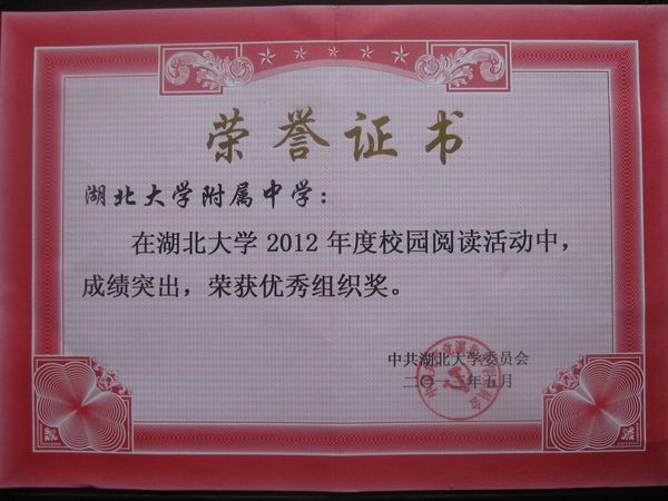 在5月8日湖北大學舉行的第二屆大學生創(chuàng)意讀書節(jié)暨手機閱讀平臺啟動儀式上,學校開展的書香校園活動受到湖北大學表彰,榮獲湖北大學2012年度校園閱讀活動優(yōu)秀組織獎。