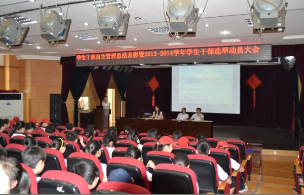 2012-2013學年度學生干部自主管理總結(jié)表彰會暨2013-2014學生干部換屆選舉動員大會于昨天中午1點在二樓報告廳舉行。學工處主任胡勝民、副主任曾國斌、校團委書記張莉出席,全體校級學生干部和年級學生干部參加會議。大會由校團委魯芳蕾老師主持。