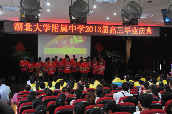 2013年7月4日上午,湖大附中在二樓報(bào)告廳舉行了以“青春如歌,感恩三年,逐夢未來,放飛夢想”為主題的2013屆高三畢業(yè)紀(jì)念活動(dòng)。學(xué)校中層以上領(lǐng)導(dǎo)、畢業(yè)班全體師生、部分家長代表出席了典禮。