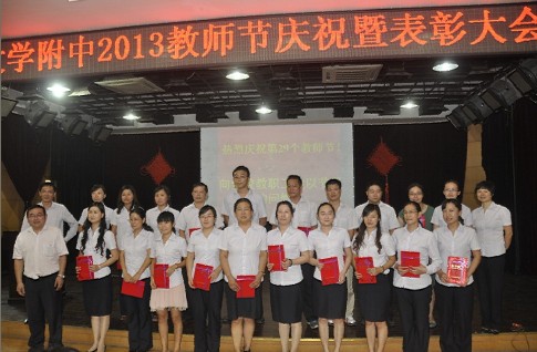 隨后,黨總支書記何鳳桃宣布退休教職工和執(zhí)教從教三十年教職工名單并頒發(fā)紀(jì)念品和證書。副校長(zhǎng)朱寧宣布2012—2013年度優(yōu)秀指導(dǎo)教師名單并主持了新學(xué)年教師師徒結(jié)對(duì)儀式。副校長(zhǎng)劉朝新宣布了武昌區(qū)優(yōu)秀班主任、湖北大學(xué)附中第二屆魅力教師、湖大附中2012—2013年度教壇新秀等獲獎(jiǎng)個(gè)人名單并頒獎(jiǎng)。