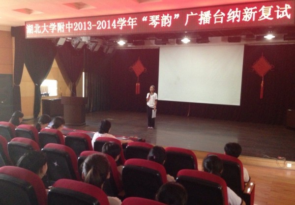 9月18日中午,逸夫樓二樓報告廳內(nèi)湖大附中2013-2014學(xué)年“琴韻”廣播臺納新復(fù)試正緊張有序地進行著。