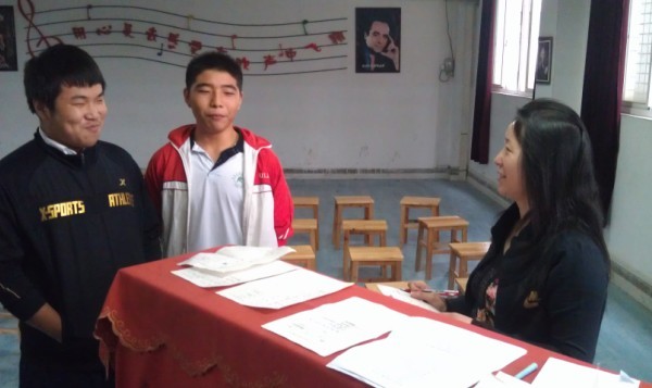 合唱團(tuán)指導(dǎo)老師對(duì)學(xué)生進(jìn)行面試