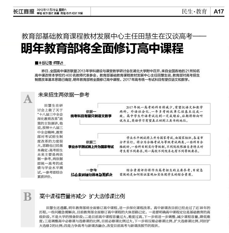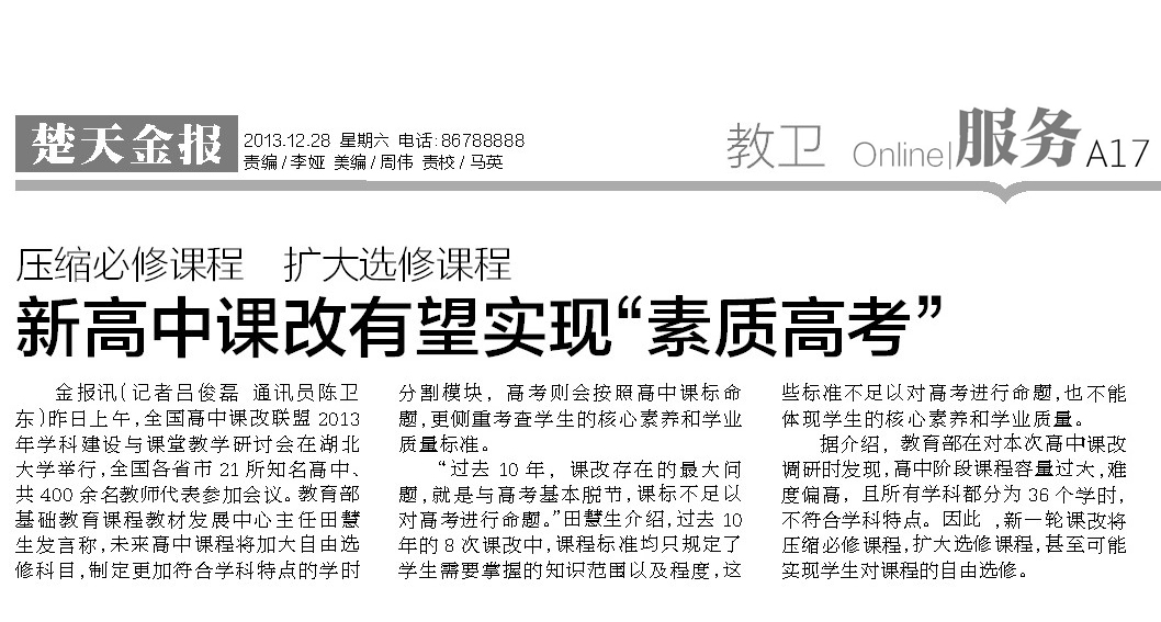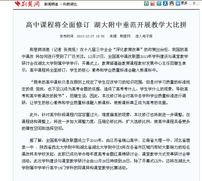12月27日~12月28日,全國高中課改聯(lián)盟2013年學科建設(shè)與課堂教學研討會在我校舉行,各大媒體采訪報道。