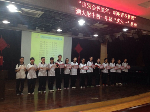 為了讓初一同學(xué)們度過最后一個有意義的兒童節(jié),首先舉行了退隊(duì)儀式。在少先隊(duì)退隊(duì)儀式上,同學(xué)們最后一次唱起了耳熟能詳?shù)摹渡傧汝?duì)隊(duì)歌》,校團(tuán)委書記張莉給大家送上節(jié)日祝福。接著,配樂詩朗誦《少年中國說》激情昂揚(yáng)響徹全場。 “少年智則國智,少年富則國富,少年強(qiáng)則國強(qiáng),少年獨(dú)立則國獨(dú)立,少年自由則國自由……”一百多年前著名思想家梁啟超先生寫給少年們的青春之歌,讓大家心中熱血沸騰。會上初一年級主任丁美芳宣讀了 “武昌區(qū)優(yōu)秀少先隊(duì)員”、“湖大附中現(xiàn)代少年好習(xí)慣形象大使”表彰名單,并給他們頒發(fā)了榮譽(yù)證書。同學(xué)們莊重地摘下了伴隨自己六年的紅領(lǐng)巾,并把它小心折疊整齊。接下來的新團(tuán)員入團(tuán)儀式上,初一年級的老師們給曾珈琪、楊慧安等20名新團(tuán)員佩戴上了團(tuán)徽。他們在鮮艷的團(tuán)旗下舉起右拳,許下青春誓言。