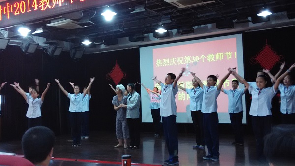 4.教師節(jié)表彰會出演舞臺劇《桂花魂》。來自新一屆校團委學生會候選人、舞蹈社、各年級學生代表共五十余名同學參與了該劇,經過為期兩周的訓練、彩排,在魯芳蕾、張莉老師的指導下,成功上演了一場感人肺腑的舞臺劇。演出現場,老師們屏住呼吸、靜靜地觀看者學生們深情的表演,最后,在一曲《愛的箴言》的歌曲中,同學們通過詩歌朗誦的方式向老師們送出了真摯的祝福和感謝的話語,老師們報以熱烈的掌聲感謝同學們的祝福,會場氣氛熱烈,校領導對該節(jié)目做了高度的肯定和表揚。