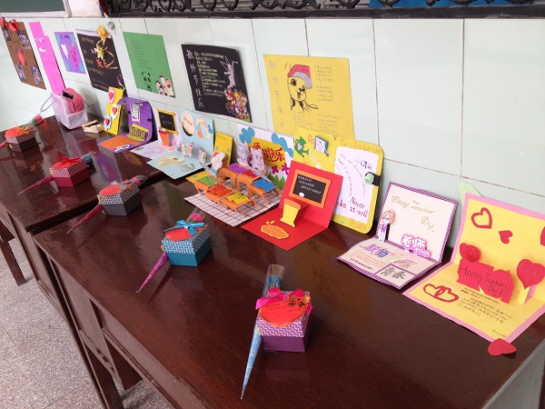 3.“有新意 有心意;有創(chuàng)意、有情意”創(chuàng)意禮物大賽。該活動要求各班至少上交3件DIY創(chuàng)意禮物,這些禮物要求創(chuàng)意、節(jié)儉、真情實感。截至9月10日,全校共上交了130余件作品,有創(chuàng)意賀卡、手工花籃、紙風鈴、環(huán)保相框桌擺……,經學工處胡主任、高一年級黨支部書記陳曉芳老師、高一年級語文黃紅星老師的投票評選,在初中選出了10件優(yōu)秀創(chuàng)意禮物作品,在高中選出了20件優(yōu)秀創(chuàng)意賀卡作品。這些活潑生動、饒有趣味的作品于教師節(jié)當天在校訓碑前展出,得到了師生們的喜愛,駐足停留,拍照留念。