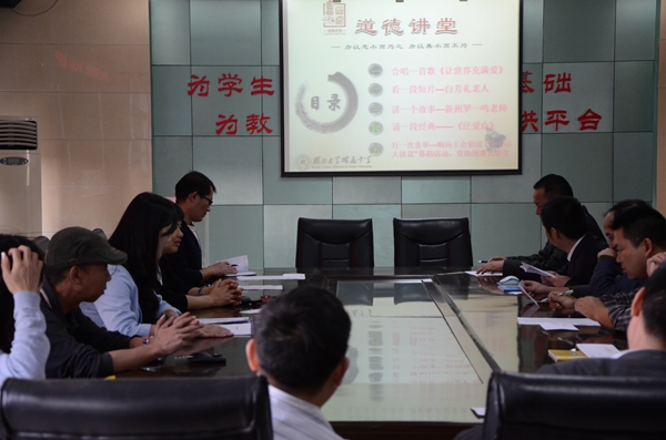 為充分展現(xiàn)“道德講堂”的感染力,活動按照唱一首歌曲、看一段短片、講一個故事,談一番感悟,誦一段經典、行一次善舉的程序依次進行。大家在合唱一首《讓世界充滿愛》的歌曲中開始,觀看一段短片《白芳禮老人》后,范志猛老師講一個我們身邊感人的故事《新洲中學羅一鳴老師故事》來傳播正能量。在學工處胡勝民主任帶領下誦讀了《弟子規(guī)》《孟子》后,大家紛紛闡述了對“愛與奉獻”的看法。短短幾十分鐘的活動,大家共同接受了一場正能量的洗禮,共同經歷了一次道德境界的升華。全體黨員和各處室成員深受教育,紛紛上臺走向捐款箱,為湖大貧困大學生獻上自己的愛心,以實際行動踐行道德講堂倡導的奉獻、互助、友愛的風尚,共籌得善款3000余元。