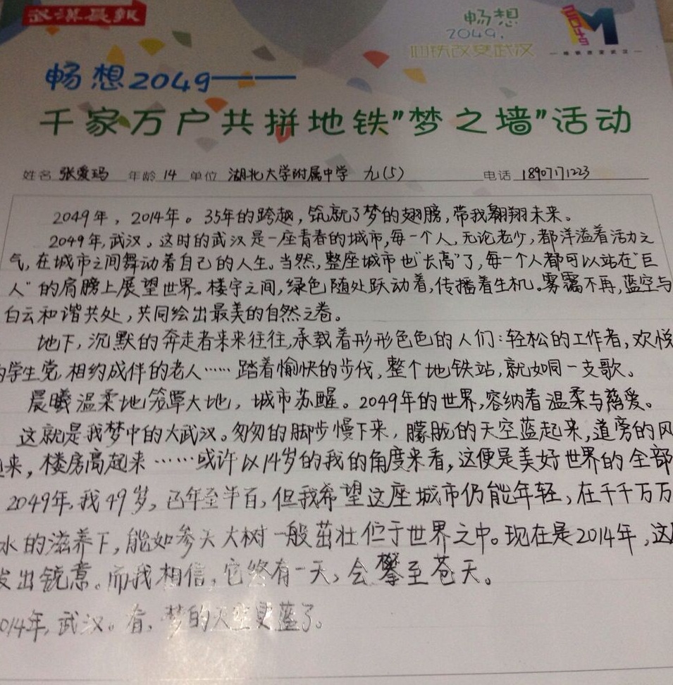 近日,武漢晨報(bào)與武漢地鐵集團(tuán)舉辦的“暢想2049——千家萬(wàn)戶共拼地鐵夢(mèng)之墻”征文活動(dòng)圓滿結(jié)束,我校初三(4)班與初三(5)班共有46名同學(xué)的作品入圍,他們的作品將刻在地鐵3號(hào)線趙家條車(chē)站的夢(mèng)想墻上,并永久保存。