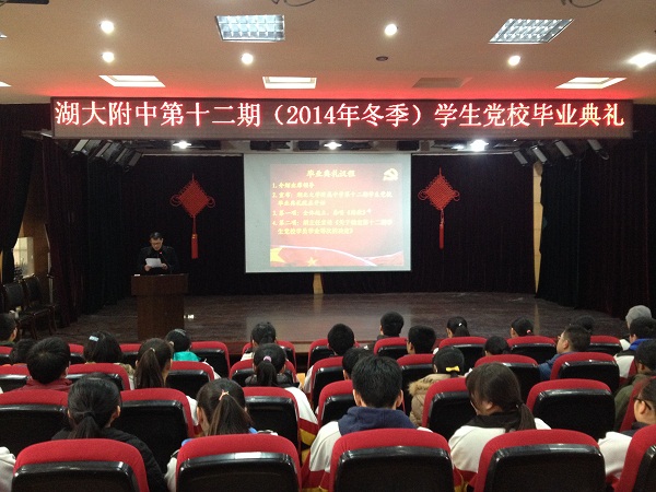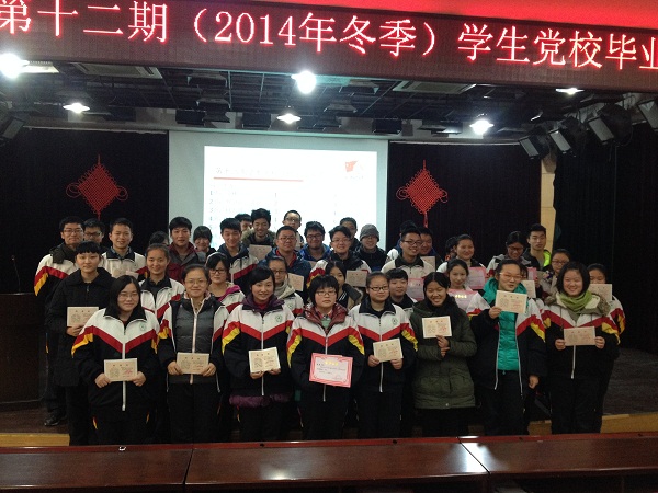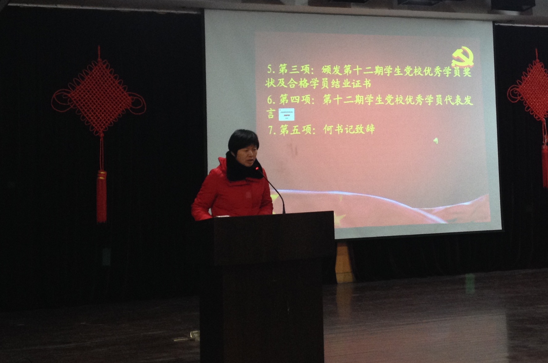 1月23日下午,我校第十二期(2014年冬季)學生黨校結業(yè)典禮在二樓報告廳隆重舉行。校黨總支書記何鳳桃、學工處主任胡勝民、校團委書記張莉、出席了本次典禮。第十二期學生黨校全體學員參加了結業(yè)典禮。結業(yè)典禮由校團委書記張莉主持。