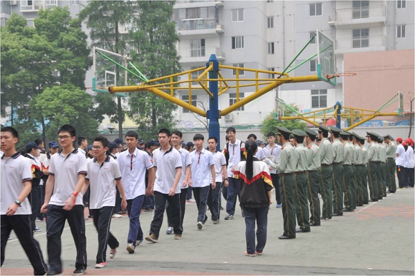 他們的演講獲得陣陣掌聲,操場(chǎng)上的高二學(xué)子們則用響徹云霄的聲音一次次傳遞著“加油!加油!加油……”的呼喊,現(xiàn)場(chǎng)氣氛迅速高漲起來。緊接著,副校長(zhǎng)朱寧代表學(xué)校為高三送來祝福和溫馨的話語,而伴隨著《年輕的戰(zhàn)場(chǎng)》的音樂響起,校黨總支書記何鳳桃和校領(lǐng)導(dǎo)、高三全體教師們?yōu)榧磳⒉饺肟紙?chǎng)的學(xué)子們系上“加油!美麗青春,相信自己”的紅絲帶,這一根根紅絲帶傳遞著愛的祝福、新的希望和難以割舍的師生情誼,許多同學(xué)在現(xiàn)場(chǎng)落下感動(dòng)的淚水,其他年級(jí)的同學(xué)們也被這種真實(shí)而感人肺腑的場(chǎng)面所打動(dòng)。在一曲勵(lì)志歌曲《我相信》的歌聲中,高三學(xué)子依次穿過由“小紅帽”和“綠軍裝”相對(duì)的筆直的通道,全校師生目送他們離開這最后一次升旗儀式的會(huì)場(chǎng)。