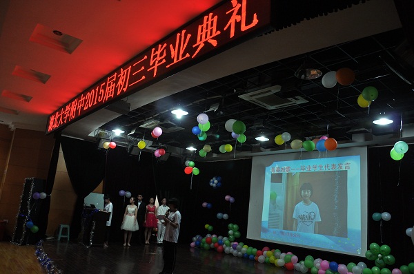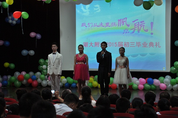 七月的校園洋溢著青春的熱烈和收獲的喜悅,七月的今天放飛著每個學(xué)子的理想和希望,7月4日上午9點整,湖大附中“感恩三年,追逐夢想”2015屆初三畢業(yè)典禮在二樓報告廳隆重舉行,校黨總支書記何鳳桃、副校長朱寧、教務(wù)處主任黃秉香、學(xué)工處主任胡勝民、校團(tuán)委書記張莉、初三年級主任江思鄉(xiāng)及全體初三教師、同學(xué)出席了本次典禮,來自初三年級的駱彤、李潤澤、李妍、顏瑞華同學(xué)主持。