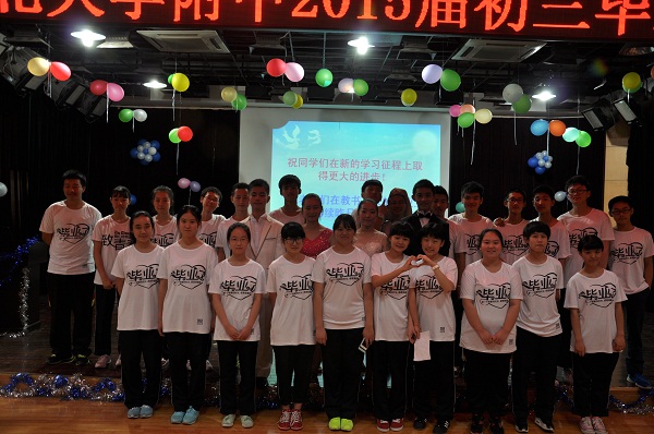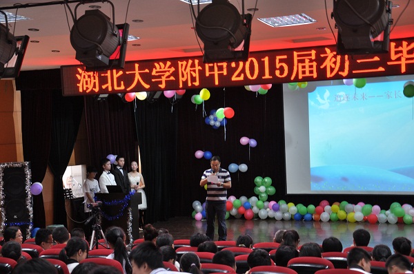 本次畢業(yè)典禮共有五個環(huán)節(jié),第一環(huán)節(jié)“青春如歌”,來自初三(5)班的張愛瑪同學(xué)座位優(yōu)秀畢業(yè)生代表作了最后一次演講,作為曾經(jīng)是轉(zhuǎn)校生的她對附中的印象非常好,嚴(yán)格有序又輕松民主的班級氣氛和豐富多彩的校園文化讓她在這個新的集體里迅速成長,雖然她已考取武漢中學(xué),但她始終不會忘記母校和老師們的恩情。第二環(huán)節(jié)“感謝師恩”,伴隨著《愛的箴言》感人肺腑的音樂聲,四位主持人為所有初三教師送上了一首贊美詩,感謝每一位教師的諄諄教誨和無私奉獻(xiàn),感謝他們寬容并包的人格魅力,并代表全體同學(xué)向老師們深深鞠躬致以誠摯的敬意,現(xiàn)場掌聲不斷。接下來的為教師獻(xiàn)花的環(huán)節(jié)十分令人驚喜,主持人用八個字給每位教師的風(fēng)格作了簡單又準(zhǔn)確的刻畫,“美麗潑辣”“溫婉可人”“井井有條”“風(fēng)趣幽默”等詞語引得了眾多同學(xué)們的掌聲。第三環(huán)節(jié)“感恩三年”,各班用視頻短片的形式回顧了三年來的學(xué)習(xí)和生活,許多教師和同學(xué)都對此感動不已,有時候熱淚盈眶,有時候掌聲連連。看著那曾經(jīng)青澀的自己,突然意識到在附中長大了,成熟了;聽著解說員一遍又一遍地表達(dá)著不能忘懷同學(xué)的友誼和寶貴的師生情誼,才意識到此刻的別離是那么令人傷感。第四環(huán)節(jié)“追逐未來”,來自初三(4)班杜若蘭的爸爸表達(dá)了他深深的謝意,并對附中的明天寄予了美好的祝福。第五環(huán)節(jié)“放飛夢想”,朱校長代表校領(lǐng)導(dǎo)為2015屆初三學(xué)子送來畢業(yè)致辭,希望同學(xué)們在新的征程上越走越好。此外,他還為各班頒發(fā)了畢業(yè)證和紀(jì)念冊。