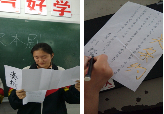 初二上學(xué)期歷史課本劇表演周在11月上旬告一段落。在中國近代史的學(xué)習(xí)中,在老師的指導(dǎo)下,學(xué)生們用課本劇的形式,小組合作表演一個(gè)個(gè)精彩的歷史劇本,如《馬關(guān)條約》《戊戌變法》等等。在活動(dòng)中,要求每個(gè)班分小組作各種準(zhǔn)備,查閱資料、編寫劇本、角色分工、道具制作、彩排等,孩子們忙得不亦樂乎,終于以精彩的課本劇形式完成了歷史活動(dòng)周學(xué)習(xí)任務(wù)。
