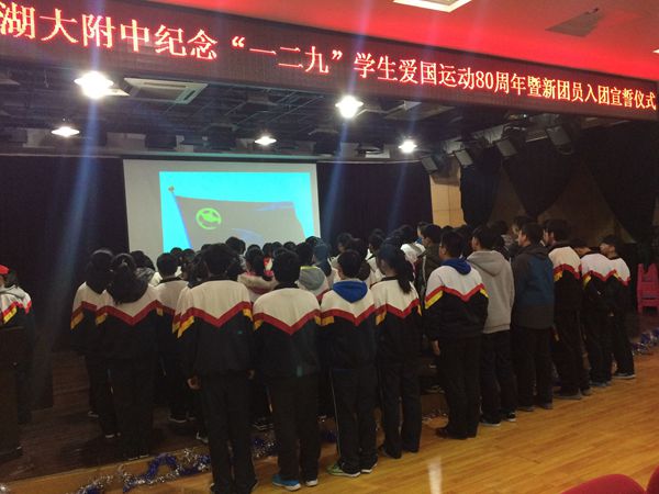 活動在莊嚴(yán)的團(tuán)歌聲中拉開序幕。首先,由校團(tuán)委張書記宣讀《關(guān)于批準(zhǔn)新團(tuán)員入團(tuán)的決定》。隨后,71名新團(tuán)員在校團(tuán)委副書記王思憶的帶領(lǐng)下,鄭重宣誓自愿加入共產(chǎn)主義青年團(tuán),校級學(xué)生干部們?yōu)樗麄兣宕髁藞F(tuán)徽。