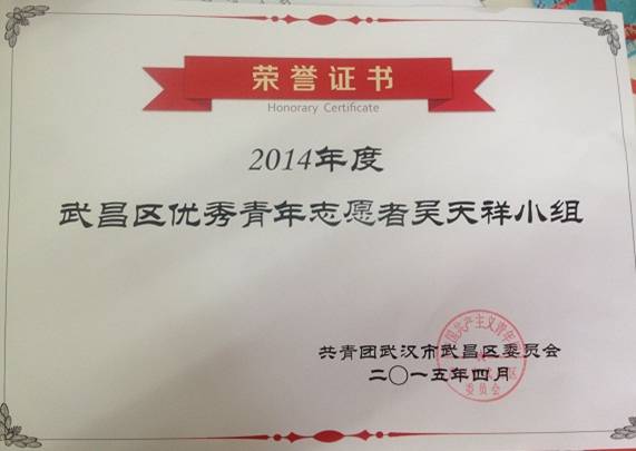 3. 我校學(xué)生志愿者服務(wù)隊(duì)被授予“武昌區(qū)優(yōu)秀志愿者吳天祥小組”稱號