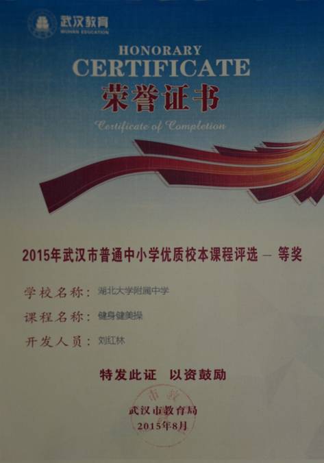 6. 課程建設(shè)呈現(xiàn)新亮點(diǎn)。“健身健美操”課程獲武漢市中小學(xué)優(yōu)質(zhì)校本課程優(yōu)質(zhì)校本課程一等獎(jiǎng)(十佳)。