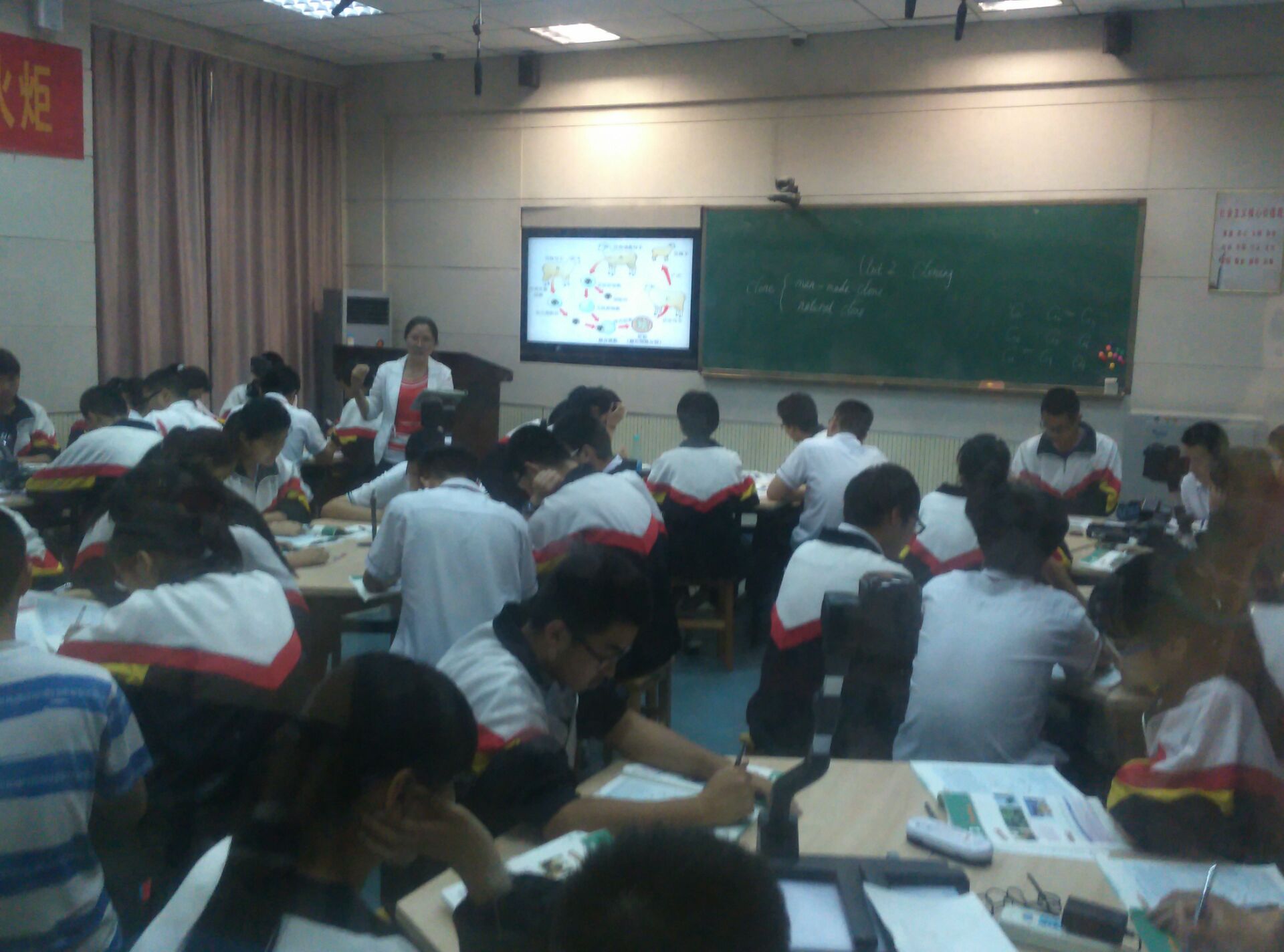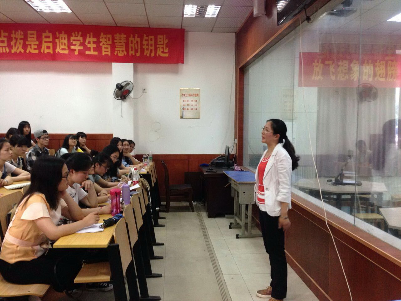 2016年5月5日下午第二節(jié)課,我年級英語教師楊昆在校課改實驗室承擔(dān)了一節(jié)向湖北大學(xué)外國語學(xué)院英語師范專業(yè)大四學(xué)生示范的課堂教學(xué)工作,五十余名湖北大學(xué)外國語學(xué)院大四的英語專業(yè)師范生參與了課堂觀摩并于課后交流。楊昆老師以高二2班學(xué)生為對象,主講了高中英語選修8模塊Unit2 Cloning一課的Warming up部分。課后,楊昆老師向大學(xué)生們講解了這堂課的準(zhǔn)備思路,介紹了目前英語教學(xué)單元組織的一般原則和教材具體把握的一些方法。大學(xué)生們向楊老師提出了關(guān)于小組合作學(xué)習(xí)模式下的小組構(gòu)成、作用,以及一般教學(xué)套路、方法等問題。黃炳香主任面對大學(xué)生們提出的小組合作學(xué)習(xí)模式等問題,向大家系統(tǒng)解說了小組合作學(xué)習(xí)模式,介紹了班主任工作技巧以及與學(xué)生溝通的方法,還結(jié)合自己從教經(jīng)驗,向諸位即將走向社會的大學(xué)生們提出了自己的建議。