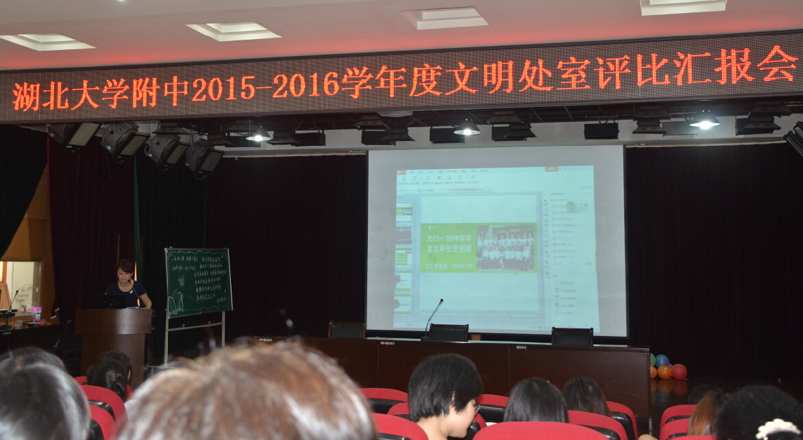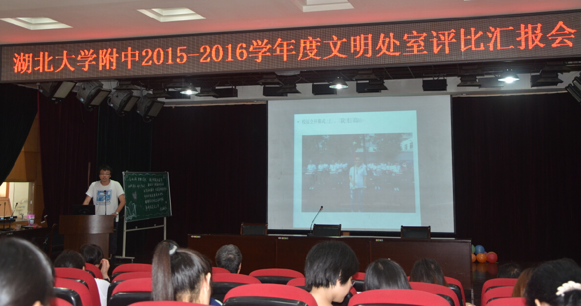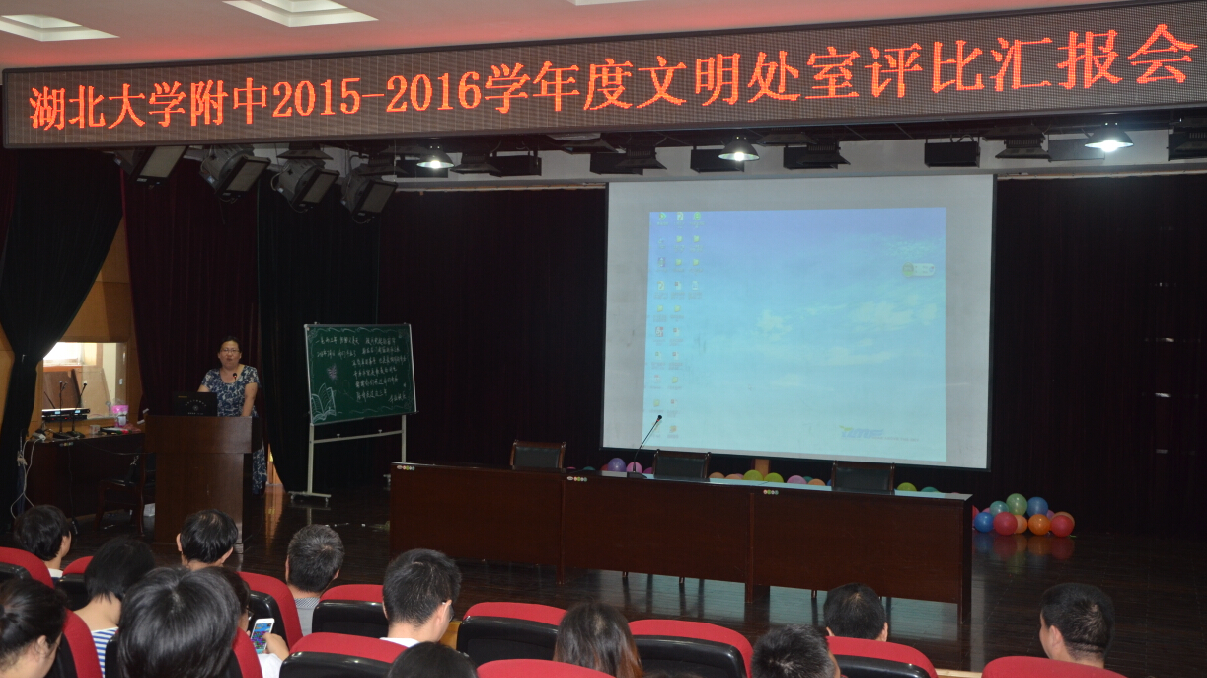 2016年7月8日上午9:00,學(xué)校在學(xué)術(shù)報告廳召開2015-2016學(xué)年度文明處室評比匯報會,全校13個年級處室中9個部門進行集中匯報展示。會議由校黨總支書記何鳳桃主持。