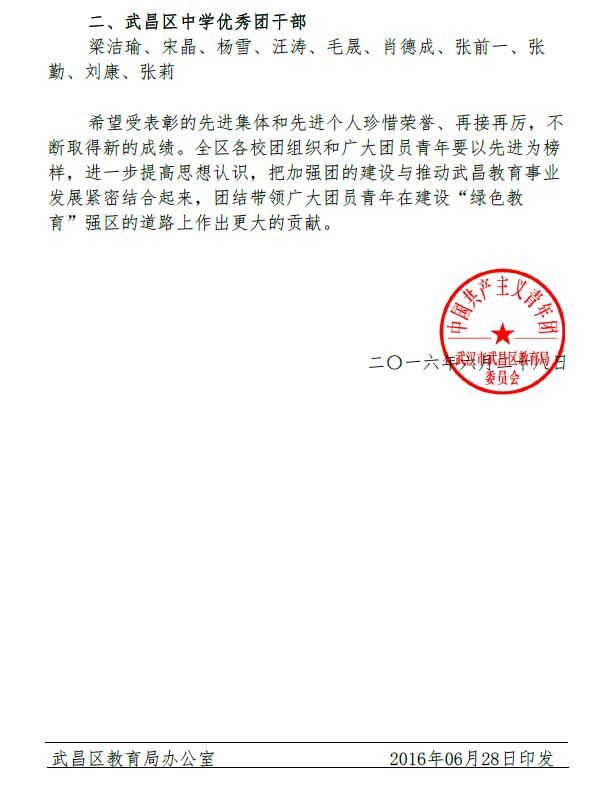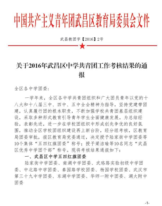 武昌區(qū)教育局下發(fā)的《關(guān)于2016年武昌區(qū)中學(xué)共青團(tuán)工作考核結(jié)果的通報(bào)》表彰了一批在2016年工作中取得優(yōu)異成績(jī)的集體和個(gè)人,我校團(tuán)委喜獲“武昌區(qū)中學(xué)五四紅旗團(tuán)委”榮譽(yù)稱號(hào)。