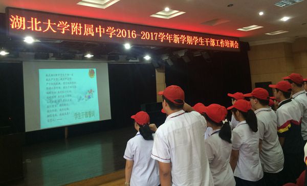 會上,大家通過視頻回顧了上一學(xué)年學(xué)生干部的工作,并對評選出的優(yōu)秀學(xué)生干部進(jìn)行了表彰。然后離任的學(xué)生干部代表們紛紛給新一屆學(xué)生干部們佩戴好工作帽和工作掛牌,并送上自己的祝福與寄語,鼓勵大家勵新一屆學(xué)生干部們“繼續(xù)團(tuán)結(jié)協(xié)作、攜手同行,踐行自己競選時的承諾,不負(fù)老師和同學(xué)們的期盼信任,不負(fù)我們的青春和夢想”。接下來參與暑期亞太學(xué)生領(lǐng)袖活動的四名學(xué)干和大家分享了活動經(jīng)歷和感悟,并告訴大家“責(zé)任 奉獻(xiàn) 擔(dān)當(dāng) 合作”是成為一名學(xué)生領(lǐng)袖應(yīng)具有的素質(zhì),他們的講述贏得了大家熱烈地掌聲。最后,新一屆全體學(xué)生干部在優(yōu)秀學(xué)干代表高二(2)班吳曉龍同學(xué)帶領(lǐng)全體下莊嚴(yán)宣誓:實踐“自我教育、自我管理”,弘揚(yáng)“忠實勇毅、求實創(chuàng)新”,嚴(yán)守校紀(jì)校規(guī),堅持以身作則,面對困難毫不退縮,面對挑戰(zhàn)勇往直前,為人生夢想而付出,為附中明天而奮斗!