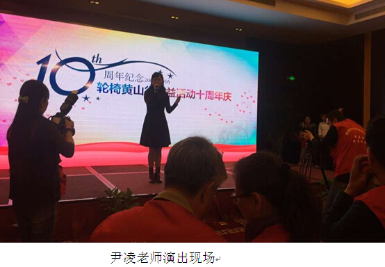 尹凌老師參加了兩場公益演出,她演唱了自己創(chuàng)作的公益歌曲《向快樂出發(fā)》《呼喚愛》《不惑人生》受到在場觀眾的熱烈歡迎與共鳴;顒悠陂g,尹凌老師主動加入到志愿者行列,與來自全國各地的多名志愿者,一起協(xié)助來自兩岸三地130多位高位截癱的輪椅患者,參觀游覽了屯溪老街,登上了黃山,親身體驗徽文化,傳遞愛與正能量。