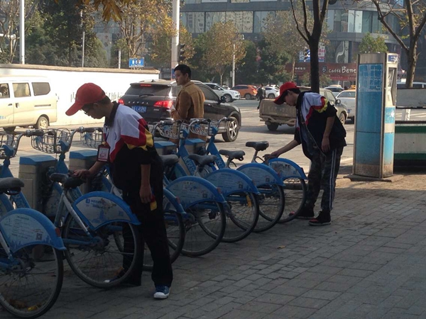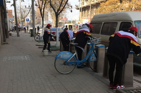 中午一點(diǎn),24名志愿者學(xué)生提著水桶、抹布等工具,在學(xué)校門前團(tuán)結(jié)路上的的公共自行車站點(diǎn),開始了他們的義務(wù)清潔自行車行動。雖然天氣寒冷,但是大家從車子到鎖止器的角角落落,都用抹布進(jìn)行認(rèn)真擦拭。經(jīng)過一中午的努力,自行車和鎖止器都煥然一新。