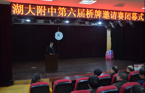 本次大賽由湖北省橋牌協(xié)會、武昌區(qū)教育局主辦,湖北大學(xué)附中承辦。邀請賽分設(shè)小學(xué)初中組、高中組和名人組,吸引了來自湖南長沙二十一中、仙桃三中、襄陽四十四中等13所省內(nèi)外中小學(xué)的運動員參加;名人組有湖北省橋牌協(xié)會副主席、湖北省人大原副主席高瑞科,湖北省橋牌協(xié)會副主席、湖北省政協(xié)原副主席胡永繼,湖北省橋牌協(xié)會副主席魯紅海,全國人大常委會委員、中國工程院院士秦順全,中鐵大橋局黨委書記、董事長梅權(quán),武昌區(qū)教育局局長王興文,武昌區(qū)教育局副局長譚藝琴等省廳局委辦、企業(yè)院校多位名人參賽。