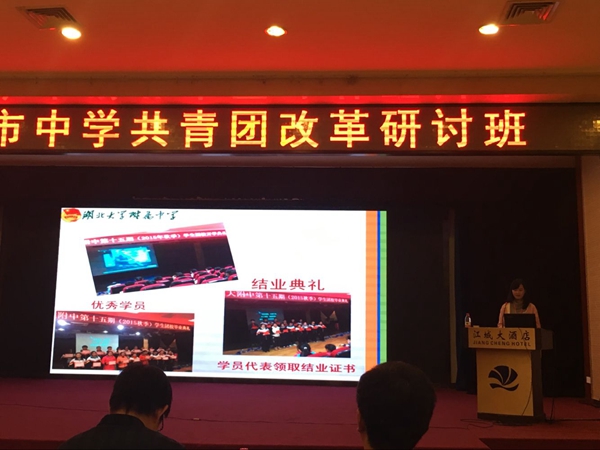 我校團(tuán)委書記張莉老師與華師一附中、武漢市七一中學(xué)、武漢臺(tái)北路學(xué)校、蔡甸區(qū)漢陽一中、湖北省實(shí)驗(yàn)中學(xué)、武漢市供銷商業(yè)學(xué)校、第一商業(yè)學(xué)校共8所中學(xué)中職學(xué)校代表,在“團(tuán)學(xué)思想?yún)R”中與全體學(xué)員分享了自己的工作成果與經(jīng)驗(yàn)。