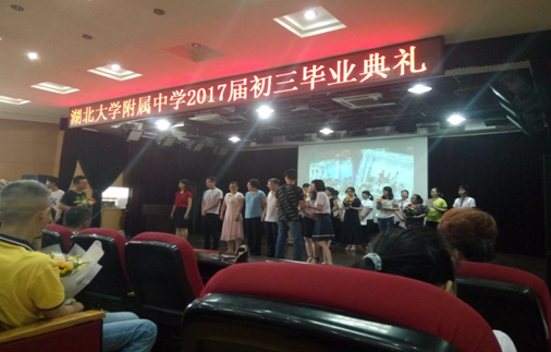 大屏幕上,主持人回放和講述著三年來四個(gè)班充滿青春氣息的一張張照片----軍訓(xùn),元旦文藝匯演, 弟子規(guī)排練, 健美操,運(yùn)動(dòng)會(huì)入場(chǎng)式,上課休息嬉戲等等場(chǎng)面。孩子們靜靜地回憶和感動(dòng)著,眼淚都不禁流下來.在游戲猜猜這是誰(shuí)和模仿老師秀中,孩子們又開心地笑了。家長(zhǎng)代表發(fā)言——現(xiàn)在你們已經(jīng)初中畢業(yè)了,迎來人生的新階段,是一個(gè)重要的轉(zhuǎn)折點(diǎn),希望你們能為實(shí)現(xiàn)理想而繼續(xù)努力拼搏。學(xué)生代表肖靜宜講述了自己的成長(zhǎng)故事,鞠躬禮向父母代表們表達(dá)了感恩之情。接著伴隨著熱烈的掌聲響起,初三年級(jí)全體任課老師們紛紛走上前臺(tái),學(xué)生們送上鮮花感謝師恩。