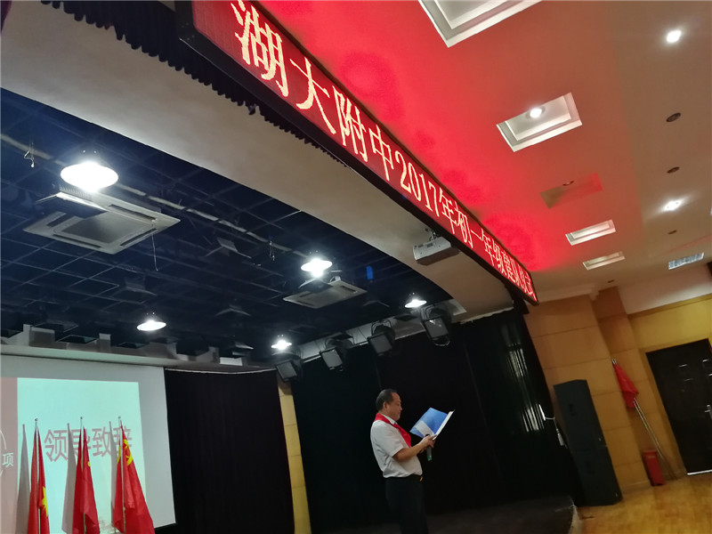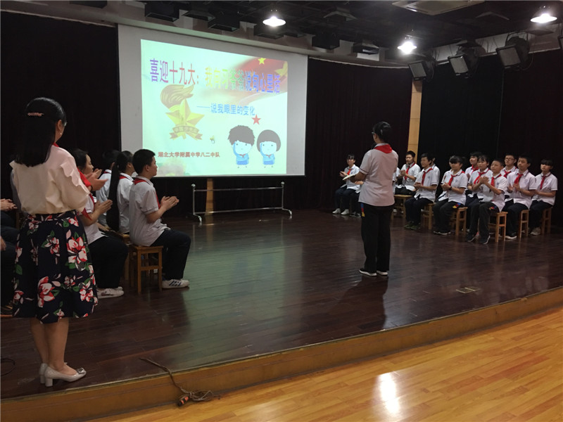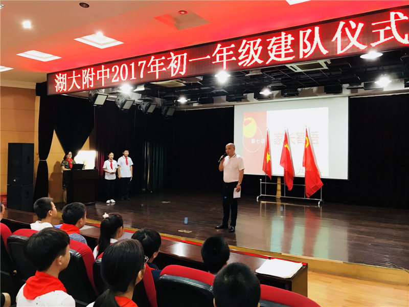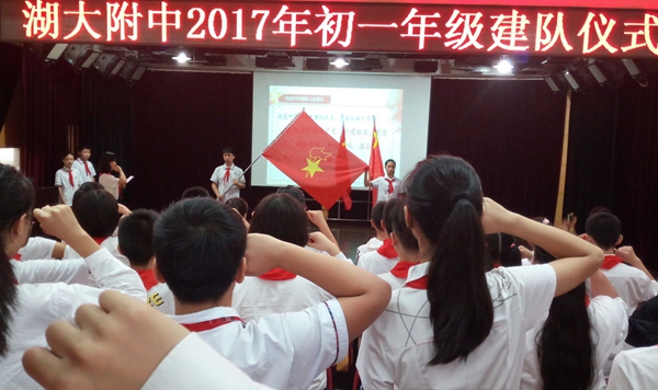 湖北大學附屬中學于2017年9月26日下午3點在學校報告廳舉行了少先隊建隊儀式和主題隊會展示,湖北省中學少先隊輔導員培訓班2百余名學員進行了觀摩學習。出席參加建隊儀式的還有有學校德育副校長馬春華、學工處主任胡勝民、副主任曾國斌,初中級部主任吳海林、七年級中隊輔導員。