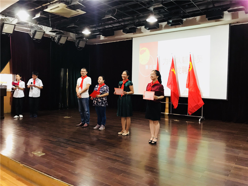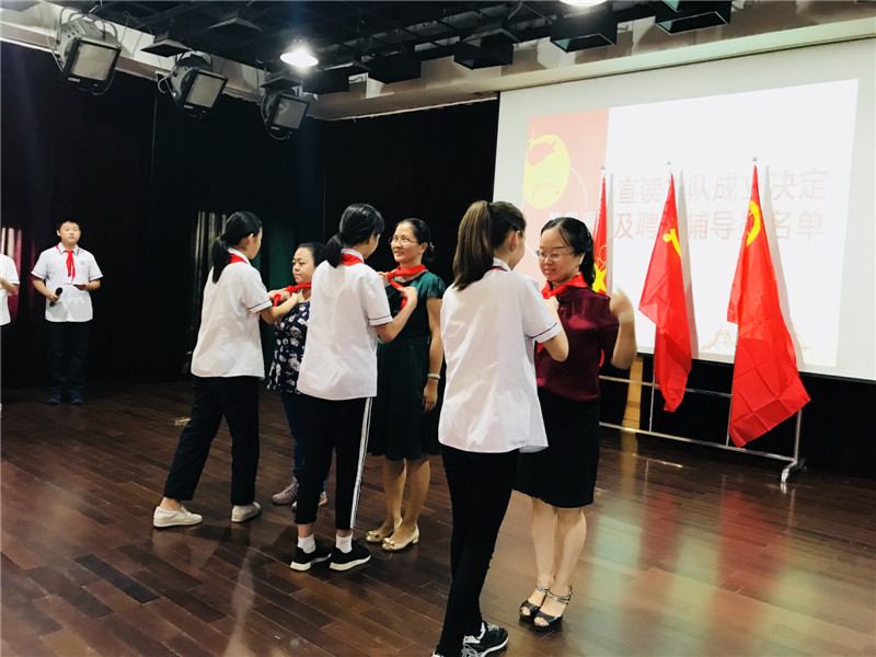 第四項,湖大附中團委書記、大隊輔導員張莉宣讀中隊成立決定和聘任輔導員名單 , 少先隊員代表為中隊輔導員戴紅領(lǐng)巾。