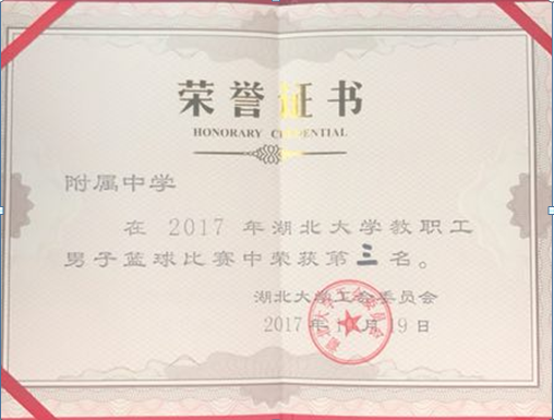 2017年10月19日下午五時30分,隨著物電學(xué)院與通識教育學(xué)院冠亞軍決賽終場哨響,為期兩周的2017年湖北大學(xué)教職工籃球比賽全部結(jié)束。由領(lǐng)隊:陳志輝,隊長:胡勝民,隊員:張振杰、章雄鋼、郭輝、黃炳香、蔡有緣、范志猛、林志元組成的附中籃球隊在全校各院系部門組成的24支代表隊中表現(xiàn)突出,勇奪賽事第三名,創(chuàng)歷史最好成績。