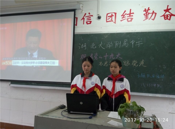 10月20日下午,湖大附中高中各支部初中各中隊舉行了“觀看黨的十九大,不忘初心跟黨走“主題團日活動。同學們認真觀看了紀錄片《領(lǐng)航》、十九大報告節(jié)選,并進行了熱烈討論,將自己的心得體會用圖文并茂的方式展現(xiàn)出來。