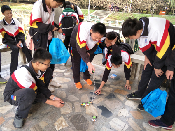 到達華中農(nóng)業(yè)大學(xué)后,同學(xué)們零距離探訪大學(xué)校園,領(lǐng)略高科技技術(shù)成果。上午進行了喻家山戶外拓展、四旋翼飛行器表演,中午就餐于華中科技大學(xué)食堂,下午在大學(xué)青年園草坪學(xué)習(xí)四旋翼飛行器的飛行原理、平衡車平衡控制技術(shù),并分組合作完成電動小車。
