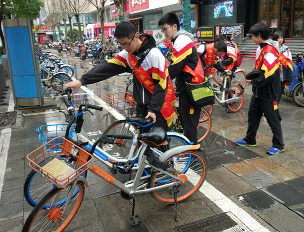 同學(xué)們的行動,不時贏來路人贊許的眼光;蛟S是受到同學(xué)們的影響,騎行的人們雖然行色匆匆,也要放好共享單車再趕路。