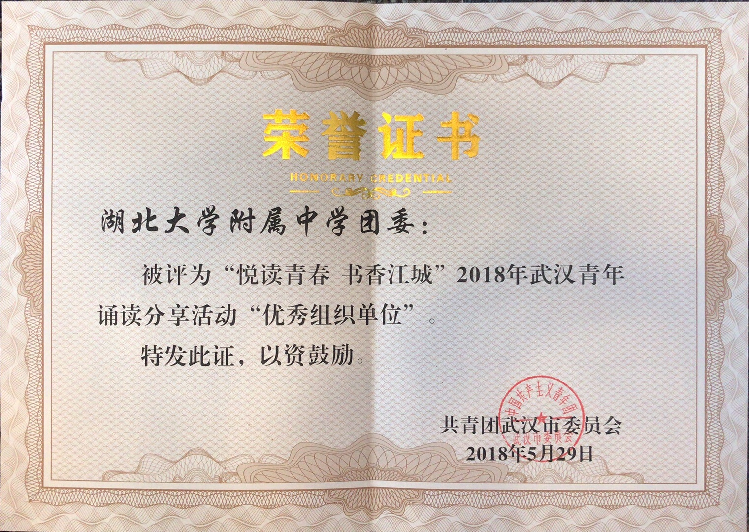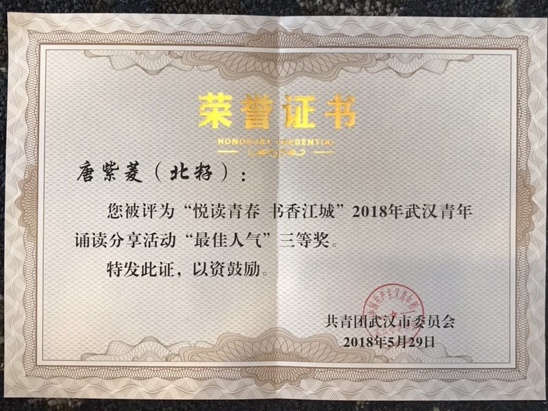 為深入學(xué)習(xí)貫徹黨的十九大精神,推進(jìn)武漢市全民閱讀行動(dòng),2018年4月份,共青團(tuán)武漢市委員會(huì)開展了“悅讀青春 書香江城”2018武漢青年誦讀分享活動(dòng);顒(dòng)期間我校團(tuán)委組織全校各年級(jí)團(tuán)員青年踴躍投稿熱情參與。根據(jù)活動(dòng)規(guī)則經(jīng)評(píng)選,我校團(tuán)委被評(píng)為“優(yōu)秀組織單位”,高一(7)唐紫菱同學(xué)榮獲“最佳人氣獎(jiǎng)”三等獎(jiǎng)。