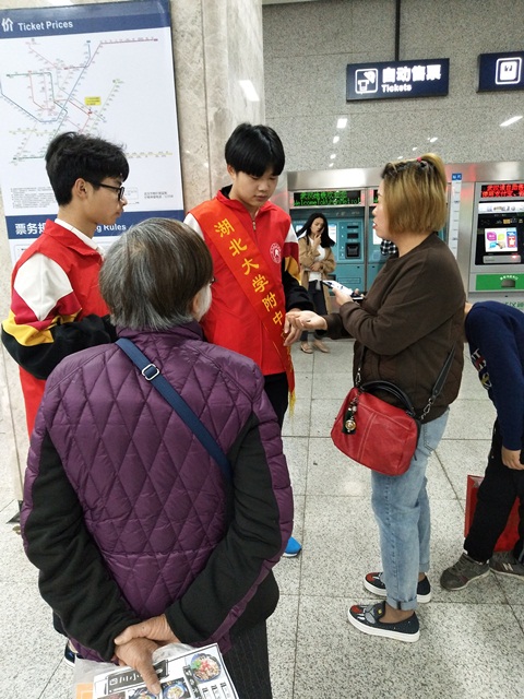 2019年3月17日上午9點(diǎn),天氣晴朗,湖大附中高一(2)團(tuán)支部的9名同學(xué)加入了志愿者的行列,他們?cè)诎嘀魅卫罾钕螓惱蠋煹膸ьI(lǐng)下來(lái)到地鐵八號(hào)線徐東站。地鐵站團(tuán)委工作人員給同學(xué)們培訓(xùn)工作內(nèi)容之后,9名同學(xué)分組分別在站臺(tái)作引導(dǎo)、出站閘口和自動(dòng)售票機(jī)前在志愿服務(wù);顒(dòng)的兩小時(shí)內(nèi),幫助了許多乘客——帶路,買(mǎi)票,充卡等。雖然地鐵站崗很累,但是能夠幫地鐵工作人員減輕擔(dān)同時(shí)收獲到那一份份謝謝和笑言,同學(xué)們都開(kāi)心不已。