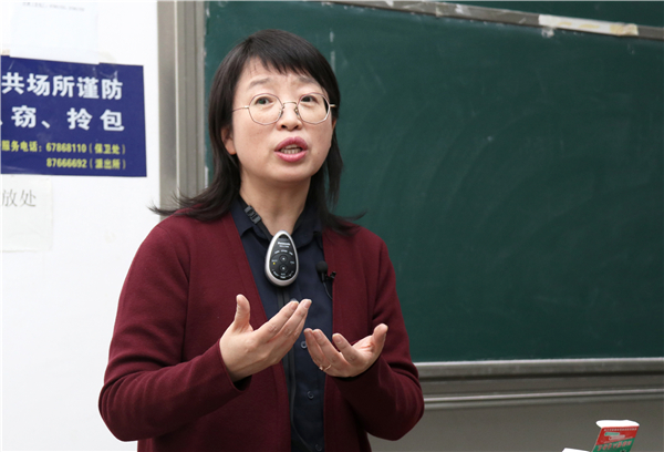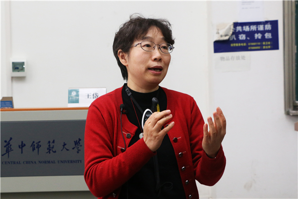 十分鐘中場休息后,王岱老師展開講解。她首先闡明學科素養(yǎng)內(nèi)涵,并提煉出語言的建構(gòu)與運用、思維發(fā)展與提升、審美鑒賞與創(chuàng)造、文化傳承與理解四大語文核心素養(yǎng)主題詞。期間,王岱老師多次運用設(shè)問,對當今教學現(xiàn)狀舉例作答,并強調(diào)語言建構(gòu)、思維發(fā)展與提升和語文活動的重要性。她認為文本的學習閱讀主要著眼點應(yīng)落在語文課堂和文本上。對此,王岱老師說:“雖說人情練達即學問,但文本重要,寫作也很重要。”接著,王岱老師提出學習任務(wù)群這一教學模式。她認為教學任務(wù)必須包括學科知識,且應(yīng)與學生的接受程度相匹配,當代老師應(yīng)具有任務(wù)意識、增強整體意識、提高統(tǒng)籌能力、實現(xiàn)教師的教學角色的轉(zhuǎn)變,尊重并強調(diào)學生的主體地位。