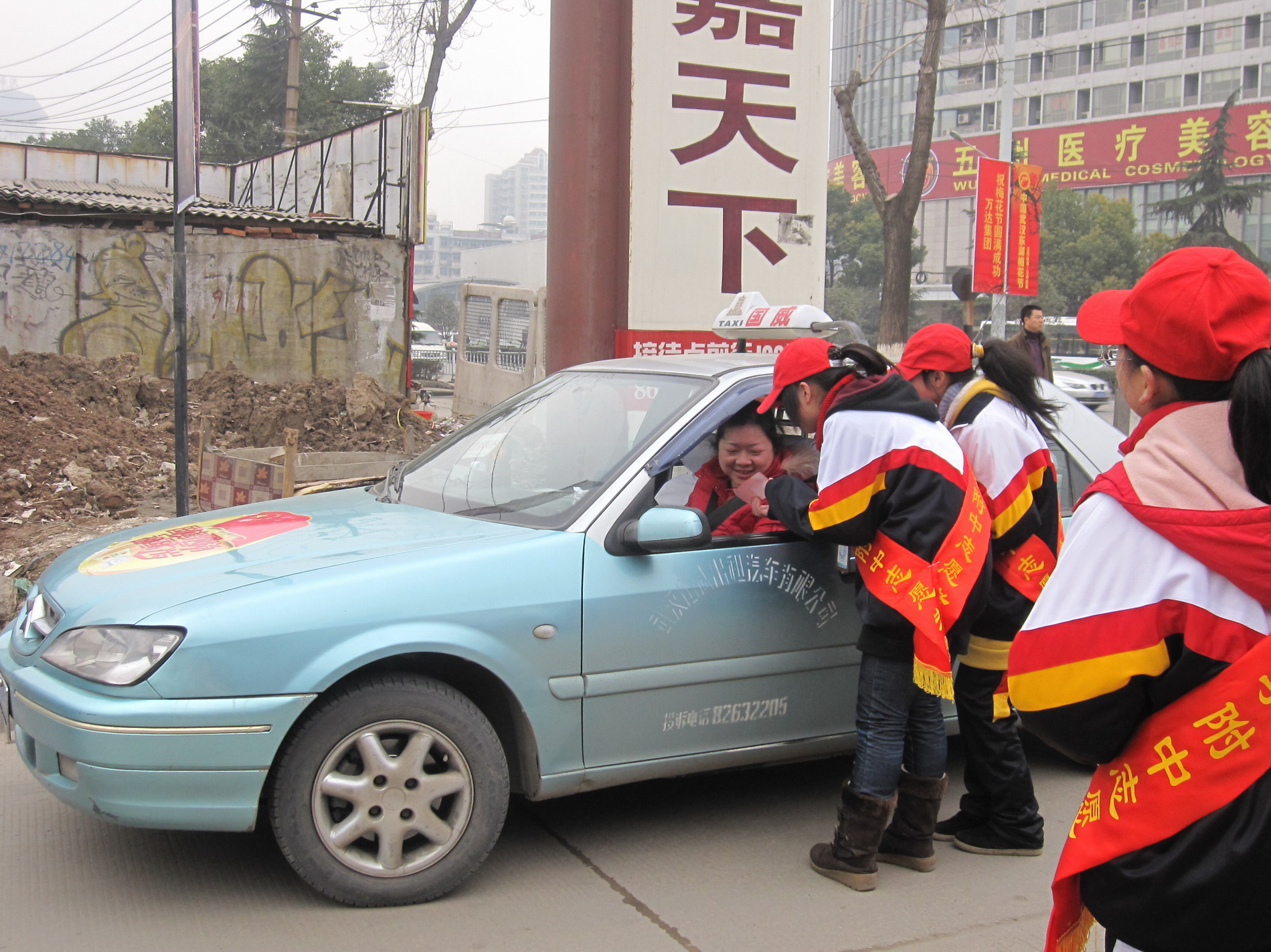 志愿者們頭戴小紅帽、身披紅色肩帶,禮貌地問候、微笑地講解活動內容,把印有“拒絕‘漢罵’,文明從這里起步”字樣的車貼發(fā)放到的士司機手中,貼在的士車身上,送給路邊的行人。發(fā)放的宣傳貼底紋圖案為煙花、禮炮和金元寶,還印有“虎年大吉”新春祝福語,看上去喜慶而洋氣。